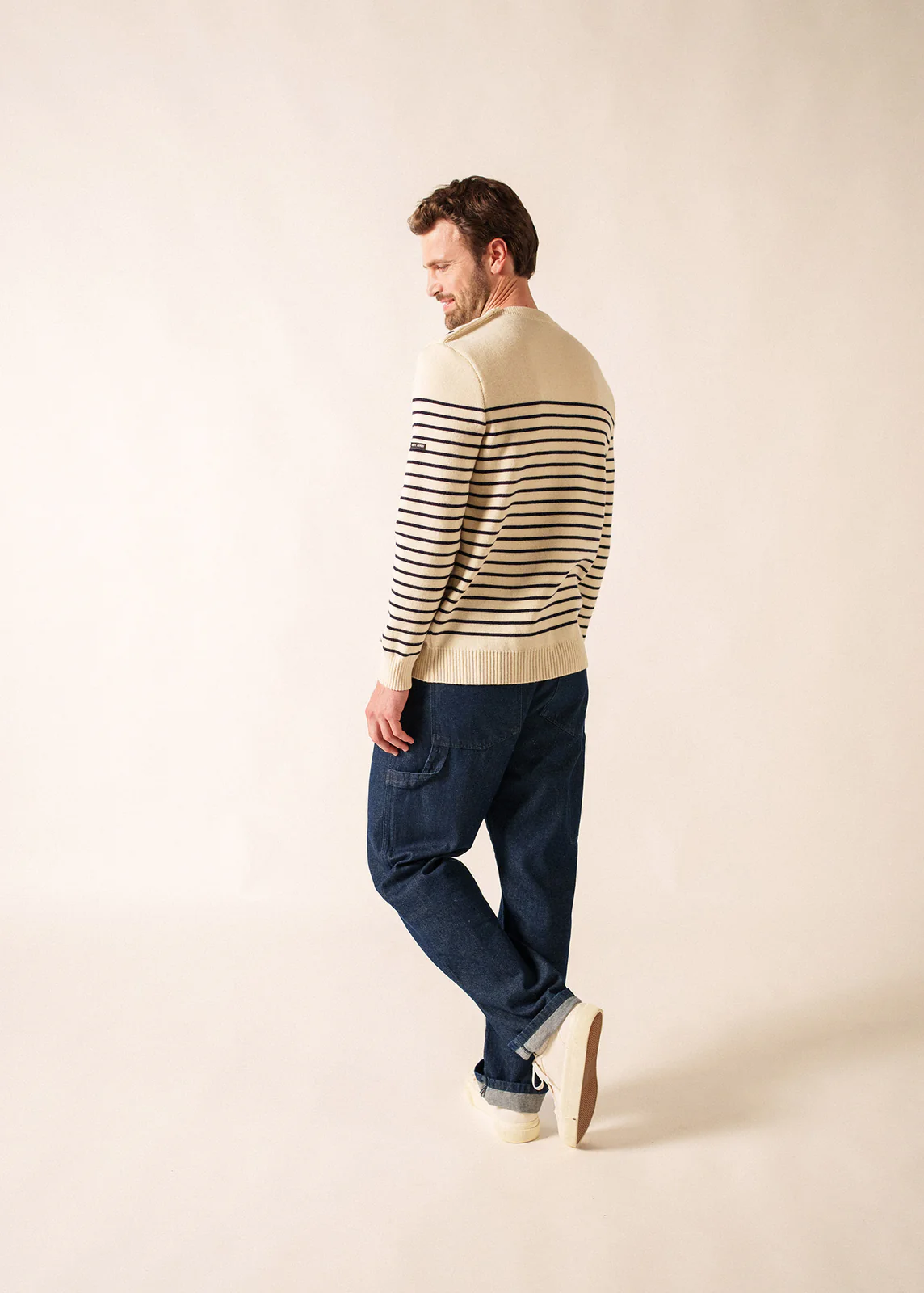 Issu de la tradition marine, le pull Binic reprend l’association des rayures et de l’empiècement uni, caractéristique des marinières. Tricoté en laine dans nos Ateliers normands, il est le témoignage de notre savoir-faire, décliné dans une version plus confortable grâce à son bord-côte en bas de corps, qui lui apporte du volume. – Pull marin